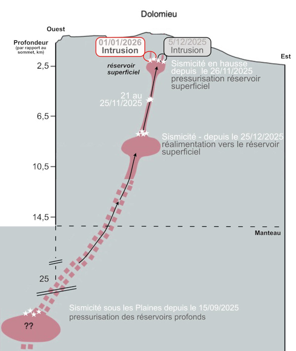 In a new update, the OVPF indicates that the seismic crisis that began on January 1, 2026, at around 4:45 a.m. (local time) has slowed considerably and can now be considered over. The seismic activity was located beneath the Dolomieu crater, at depths between 1.6 and 2.3 km below the surface.