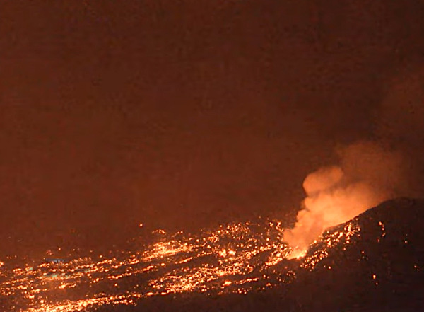 The eruption of Piton de la Fournaise continues quietly on the south-southeast flank of the volcano. When the eruption began, the lava flow front rushed down the slopes at a relatively rapid speed, and the lava reached the Grandes Pentes area in the late afternoon. Then, the eruptive flow rate slowed considerably. It was estimated overnight to be between 2 and 19 m³/sec. Between 10 p.m. and 6 a.m., the lava had traveled 300 meters and, at 6 a.m., was located 3 km from RN2, the aptly named Route des Laves (Lava Road). However, at the current rate, it is very unlikely that it will reach this road.