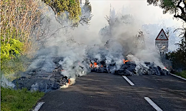 Piton de la Fournaise (Île de la Réunion) : la RN2 à nouveau coupée par la lave ! // Lava crosses the RN2 highway again !