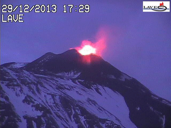 30 December: 11:30: Strombolian activity continues at the NSEC. INGV’s thermal webcam (see below) shows occasional small lava fountains above the crater. The tremor and seismicity keep a fairly high level. Contrary to the previous « paroxysms », the latest strombolian events are longer and less intense.