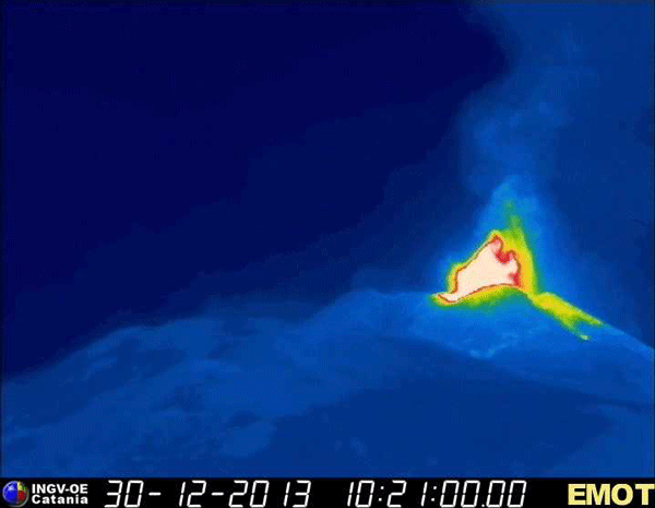 30 décembre 2013 : 7h30 :Au vu des archives de la webcam L.A.V.E. et des données sismiques à nouveau accessibles sur le site web de l’INGV, on se rend compte que l’activité strombolienne a persisté de manière assez intense jusque vers 2 heures du matin. Elle a ensuite décliné mais demeure présente au moment où j’écris ces lignes. Dans le même temps, la sismicité connaît un lent déclin.