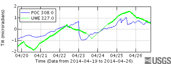 On observe depuis le 20 avril une tendance globale au gonflement du Kilauea, probablement due à une montée de magma sous l’édifice volcanique, comme cela se produit périodiquement à Hawaii.