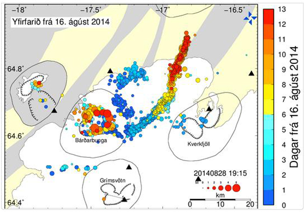 14 heures: Il semblerait que la lave ait cessé de sortir de la fracture qui s’est ouverte cette nuit. Les gardes-côtes islandais indiquent que la fracture d’une longueur d’environ 900 mètres se trouve à environ 10 km au nord de la langue glaciaire du Dyngjujökull. Contrairement à ce que l’on pouvait entendre à la radio ce matin (France Info en particulier), le siège de l’éruption n’est pas le Barðarbunga et le spectre d’une éruption sous-glaciaire évoqué par J.M. Bardintzeff sur cette même radio n’est pas à l’ordre du jour en ce moment. Personne ne sait comment la situation va évoluer. Il est surprenant de voir que la fracture éruptive a émis une très faible quantité de lave, alors de l’intrusion magmatique est très importante (estimée à 270 millions de mètres cubes), mais rien ne dit qu’une éruption sous-glaciaire comme en 2010 se profile à l’horizon. Il se peut que le dyke reste en place sans suite éruptive. Il est inutile d’inciter les médias à faire du catastrophisme; les journalistes en font suffisamment comme ça!