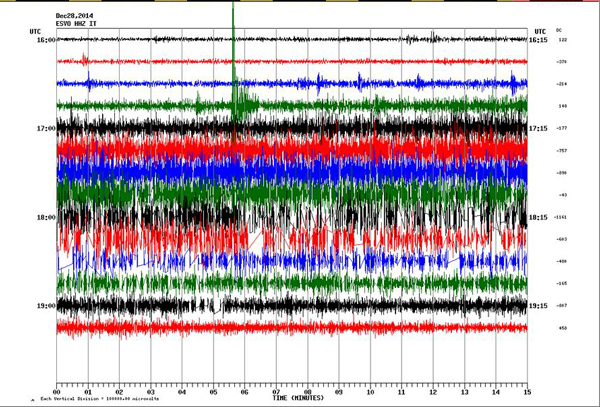 Does Mount Etna fell like waling up? A frequent visitor of my blog has drawn my attention to an episode of activity that took place today in the late afternoon. The LAVE webcam shows some glow through the thick fog that shrouded the volcano. The seismographs leave little doubt about the eruptive episode that, most likely, shook the New SE crater. The newspaper La Sicilia reports ashfall and lapilli between Milo and Giarre or Risposto. Tonight, seismicity has retrieved a much lower level. Is it a single eruptive episode or the beginning of a more serious event? No one knows. The next few hours or the next few days will give us the answer.
