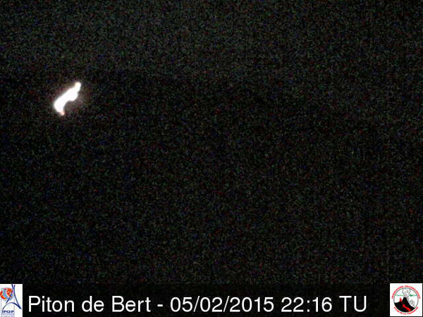 13 :00 : (Paris time): According to the Observatory, the eruption which began late in the morning of February 4th was still fairly stable today in the early hours of the morning (local time), as confirmed by the tremor. However, during the morning, the tremor began to show a significant decline. When the weather cleared up, the images of the Piton de Bert webcam no longer showed any visible lava flow. The top of the eruptive fissure was still smoking. Under these conditions, the eruption could end quickly. Inclement weather on Wednesday did not allow to make lava samples to find out its composition. Moreover, a team that left this morning to perform gas analysis at Piton de Bert (facing the eruption) turned around as the levees under the rain would not be revealing.