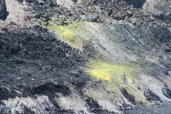 The ongoing summit eruption began on March 19th 2008, after several months of increasing seismic tremor and gas emissions and new sulphur deposits (see photo below). A small explosion opened a new crater (referred to as the “Overlook crater”, because it is located immediately below the former National Park visitor overlook) on the south wall of Halema’uma’u Crater.