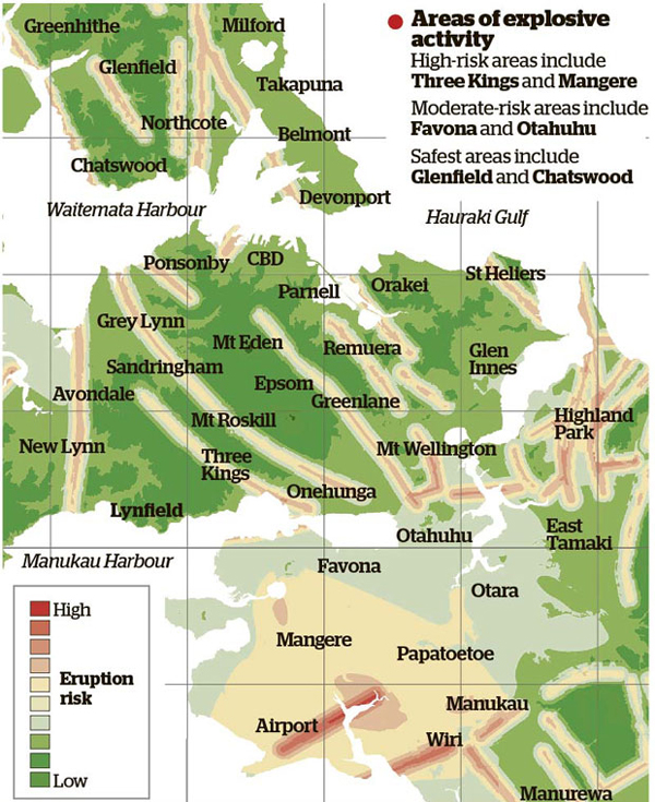 Recently published maps show which areas are more at risk from phreatic or phreato-magmatic eruptions. Scientists have shown how more than three quarters of the 52 volcanoes in the vast Auckland Volcanic Field bear ancient evidence of such activity.