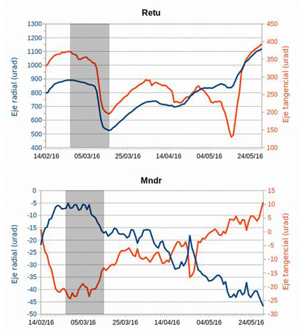 Déformation du Tungurahua entre le mois de février et la fin du mois de mai 2016. La zone grise symbolise la dernière éruption. (Source: IG)