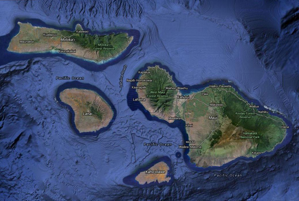 De droite à gauche: Maui, Lanai et Molokai (Source: Google maps)