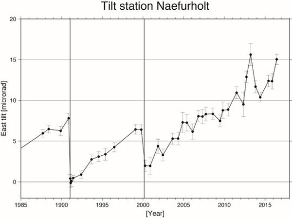 Graphique montrant l’évolution de la déformation de l’Hekla entre 1985 et aujourd’hui. On remarquera la déflation de l’édifice qui a accompagné les éruptions de 1991 et 2000 lorsque le magma s’est évacué. Le tilt présente une hausse globale depuis 2000 et a même dépassé le niveau d’avant cette dernière manifestation du volcan. (Source: Icelandic Met Office)