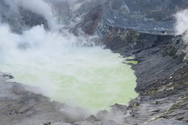 Vue du lac d’acide dans le cratère le 6 septembre 2016 (Crédit photo: GNS)
