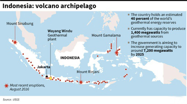 L’Indonésie, avec ses innombrables volcans, détient environ 40 pour cent des réserves géothermiques mondiales, mais le pays a pris beaucoup de retard dans leur exploitation. Aujourd’hui, le gouvernement indonésien a l’intention de multiplier par cinq la production géothermique dans la prochaine décennie, bien que les obstacles soient énormes dans un pays qui croule sous le fardeau de la paperasserie et où les grands projets sont souvent retardés, voire annulés.