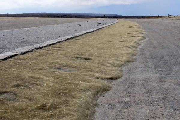 HVO has recently released an article entitled « Amber waves of … Pele’s hair? », referring to the downwind side of Halema’uma’u Crater which has been strewn with Pele’s hair since the opening of the active vent in 2008. A photo taken in April 2013 already showed accumulations about a metre on the windward sides of the curbs in the Halema’uma’u parking lot which is closed to the public (see photo above).