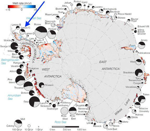 Cette carte de l’Antarctique montre la fonte de la partie inférieure des plateformes glaciaires. La teinte bleue symbolise la perte de glace de plus de 5 mètres d’épaisseur par an. La flèche indique la plateforme glaciaire Larsen C. (Source: NASA / JPL-Caltech / UC Irvine / Columbia University).