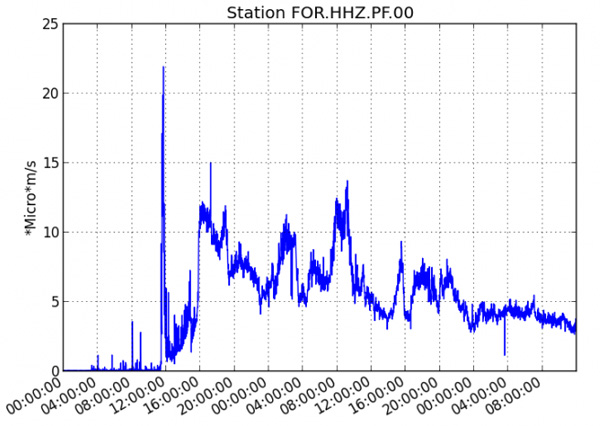 The eruption that began on January 31st, 2017 continues with a moderate intensity revealed by the eruptive tremor which maintains an average level, with less fluctuations in the last 8 hours, compared to the first 24 hours.