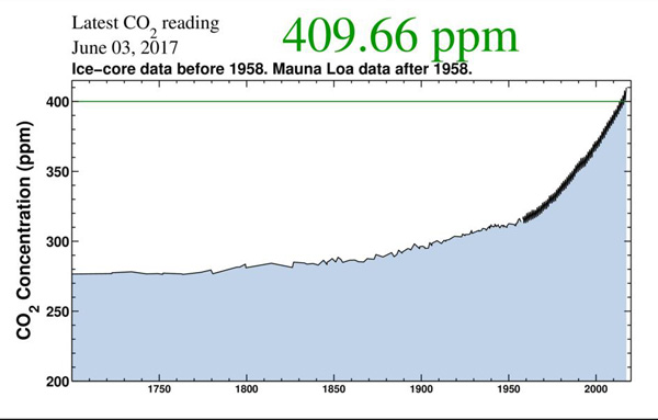 La courbe de Keeling début juin 2017. Son évolution se passe de commentaires (Source: NOAA)