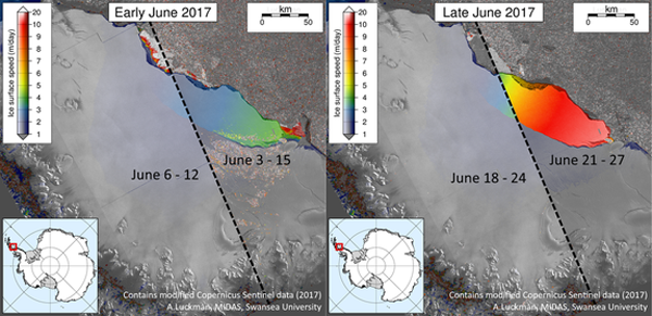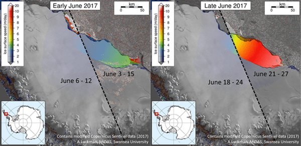 The scientists from Project MIDAS are using satellite observations to determine the progress that the rift is making. In some places, the fissure is 450 metres wide. In a June 28th update, the scientists report: « …The soon-to-be-iceberg part of [the] Larsen C Ice Shelf has tripled in speed to more than ten metres per day between June 24th and 27th 2017. » This is the highest speed ever recorded on this ice shelf. Predicting the exact date that the iceberg will cleave off from the Antarctic continent is tricky. One can’t tell when calving will occur; it could be hours, days or weeks.