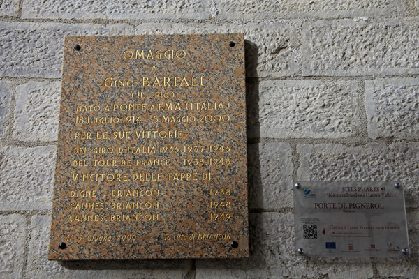 Depuis Briançon, j’ai refait une partie de l’Etape du Tour 2017 avec l’arrivée en haut du Col de l’Izoard. Là encore, la montée n’est pas une mince affaire, même si, dans mes souvenirs, elle est moins raide que celle du Galibier, Monsieur Galibier, comme l’appelait le caricaturiste Pellos. Le passage dans la Casse Déserte est toujours aussi impressionnant et somptueux. J’y ai fait une halte, le temps de prendre en photo la double stèle à la mémoire de Louison Bobet et Fausto Coppi. Il faut dire que le cyclisme est à l’honneur dans cette partie des Alpes et une plaque au niveau de la Porte de Pignerol à Briançon honore Gino Bartali.
