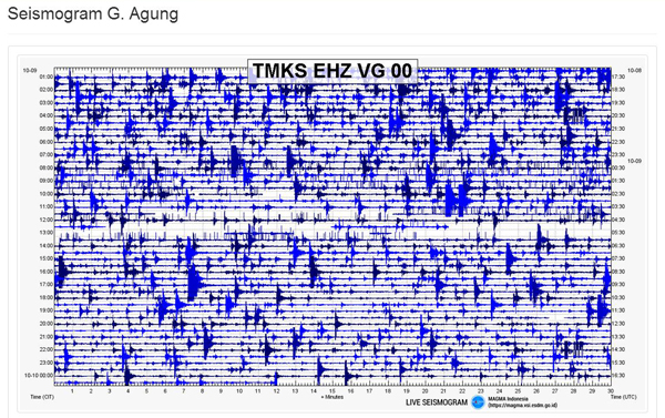 L’Agung est en niveau d’alerte maximal (4 / AWAS) depuis le 22 septembre 2017 et les dernières observations incitent les volcanologues indonésiens à ne rien changer. En effet, la sismicité reste élevée. Au cours de la journée du 8 octobre, on a enregistré 252 séismes d’origine volcanique peu profonds, 487 séismes profonds et 74 événements locaux d’origine tectonique. Les observations visuelles ont permis d’observer un panache de gaz et de vapeur d’une hauteur d’environ 200 mètres au-dessus du cratère. La hauteur maximale de ce panache (1500 mètres environ) a été observée dans la soirée du 7 octobre 2017.