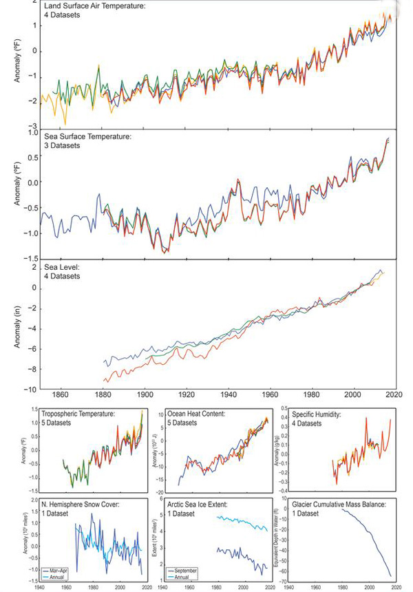 Here are a few graphs recently released by the US Global Change Research Program. They summarize quite well the current situation of the planet about climate change and its effects on temperatures, oceans and sea ice.