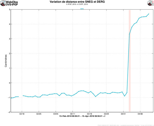 Evolution de l’inflation du Piton de la Fournaise entre le 13 février et le 13 avril 2018 (Source: OVPF)