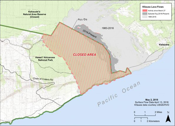 Hawai‘i Volcanoes National Park reports that due to the possibility of a new eruption and unstable geologic activity, parl authorities have closed an area including the gravel emergency access road from the eastern gate near Kalapana, to the western gate at the end of Chain of Craters Road, and all land on the ocean side of the emergency road.
