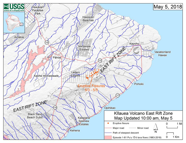 9h00 (heure française): L’éruption se poursuit le long de la Lower East Rift Zone du Kilauea, dans la subdivision des Leilani Estates. De nouvelles fractures parcourues de bouches éruptives actives se sont ouvertes au cours de la matinée du 5 mai 2018, et l’apparition d’autres fractures actives est probable dans la région.