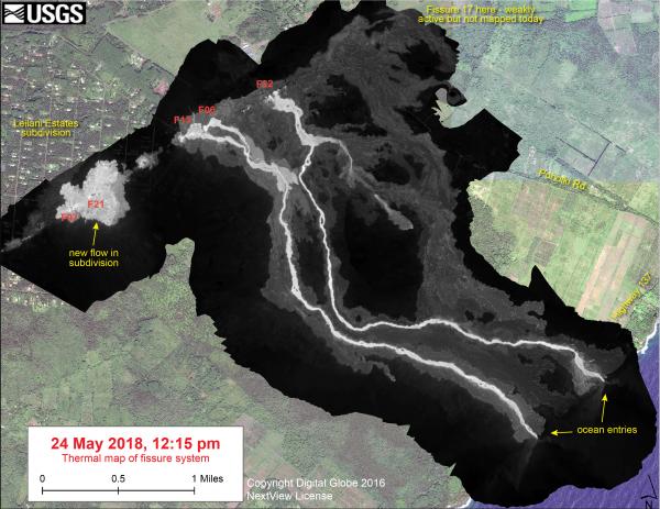 Lava from fissure 22 continues to feed one lava river that is flowing into the ocean, while fissures 6 and 13 are feeding a second ocean entry.