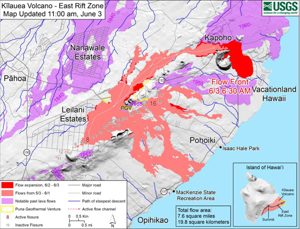 7:00 a.m. (French time): Fissure 8 continues to feed a large channelized flow traveling downslope toward the ocean at Kapoho Bay between Kapoho Beach Road and Kapoho Kai Drive. Lava is advancing along an 800-metre-wide flow front which was about 400 metres from the ocean as of 12:30 p.m. on June 3rd, 2018. More houses are likely to be destroyed.