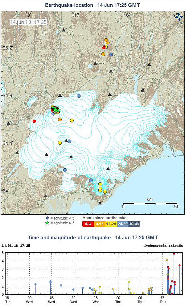 A 03h19 (heure locale) le 14 juin, une nouvelle petite explosion s’est produite au sommet du Kilauea, avec un panache qui a atteint 1800 mètres au-dessus du niveau de la mer. Cet événement et de nombreuses autres secousses moins fortes ont été ressentis à Volcano et auront sans aucun doute affaibli encore davantage les structures à l’intérieur du Parc National. L’affaissement de la lèvre et des parois de l’Halema`uma`u continue en relation avec la déflation continue du sommet.