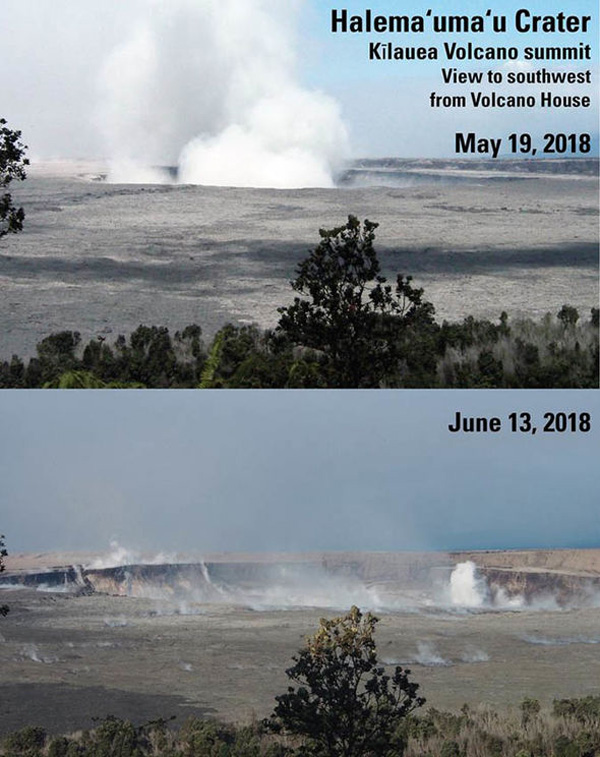 At the summit of Kilauea Volcano, Halema’uma’u Crater has changed dramatically since early May 2018. With the successive sinkings and collapses, the depth of the crater has more than tripled and the diameter has more than doubled. Seismicity is very high. Before May, about 10 earthquakes per day were usually recorded at the summit. As of late June 2018, there are about 600 earthquakes on a daily basis. Many of these earthquakes are strong enough to be felt, and some can be damaging. They are causing concern, especially in Volcano Village and its surroundings.