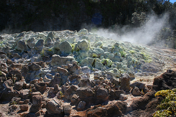 Native Sulfur: Sulfur is also stable in its elemental form, known as “native sulfur.” This form of sulfur is a yellow crystalline solid. At Kīlauea, native sulfur is found at volcanic fumaroles, such as Sulphur Banks, where both SO2 and H2S gases are emitted.