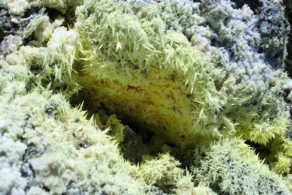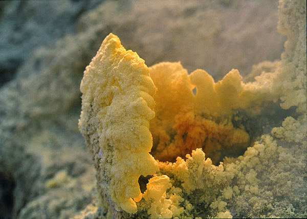 Le soufre est un élément chimique très répandu sur les volcans actifs où on peut le trouver sous différentes formes.