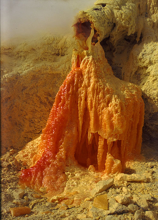 Sulfur is a widespread chemical element on active volcanoes where it can be found in different forms.