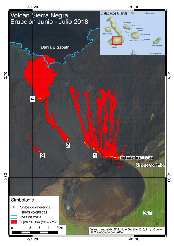 Selon l’Institut de Géophysique équatorien, l’éruption du Sierra Negra (Galapagos / Equateur) continuait le 23 juillet, avec des variations d’intensité. Quatre fractures se sont ouvertes au début de l’éruption le 26 juin. La fracture 1 mesure 4 km de long et se situe au bord de la caldeira. Les coulées de lave provenant de cette fracture ont parcouru 7 km le long des flancs du volcan et 1,7 km à l’intérieur de la caldeira, couvrant une superficie de 16,1 kilomètres carrés. La fracture 2 est longue d’environ 250 mètres, au nord-ouest de la caldeira, et a produit des coulées de lave qui ont parcouru 3 km et couvert une superficie de 2,3 kilomètres carrés. La fracture 3, située à l’ouest de la caldeira, mesure 250 mètres de long et produit des coulées de lave qui descendent sur 2 km le long des flancs du volcan, couvrant une superficie de 0,3 kilomètre carré. Les fractures 1-3 sont restées actives jusqu’au 27 juin. La fracture 4, longue de 250 mètres et située sur le flanc nord-ouest, continue d être active. La lave de cette fracture a atteint l’océan entre le 9 et le 10 juillet et, le 16 juillet, couvrait une superficie de 11,6 kilomètres carrés. En tout, une surface de 30,4 kilomètres carrés était couverte par la lave en provenance des quatre fractures.