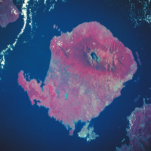 Image satellite dans l’infrarouge de l’île de Lombok avec le Mont Rinjani identifiable par son lac de cratère (Crédit photo : Wikipedia).