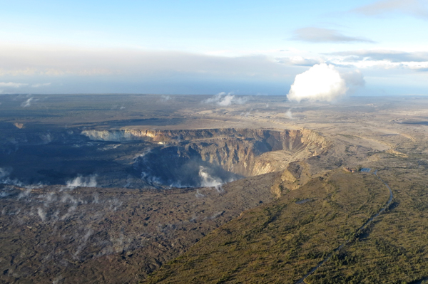 This aerial view of Kilauea’s summit (taken on July 28th in the early morning, looking south) shows the new morphology of Halema’uma’u Crater after the collapses of the summit caldera floor. Several features are clearly visible: Crater Rim Drive (lower right) leads to the USGS Hawaiian Volcano Observatory and NPS Jaggar Museum (right, middle), perched on the caldera rim and overlooking the growing Halema‘uma‘u. Ground cracks, parallel to the crater rim, are visible on the north side of Halema‘uma‘u (left side of image). South Sulphur Bank stands out as the light-coloured area on the opposite crater wall.