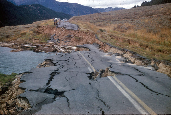Route détruite par le séisme de 1959 à Yellowstone (Crédit photo : USGS)
