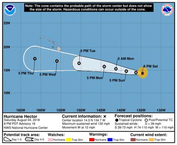 L’ouragan Hector – de niveau 4 depuis quelques heures – se rapproche d’Hawaï et effleurer la Grande Ile mardi ou mercredi. Les scientifiques se demandent si le système de basses pressions généré par l’ouragan pourrait avoir un effet sur l’éruption actuelle dans la Lower East Rift Zone. Certains pensent que les basses pressions atmosphériques pourraient entraîner une augmentation de l’activité volcanique.