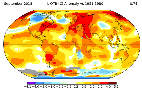 Anomalies thermiques pour septembre 2018 (Source: NASA)