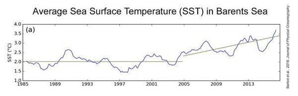 New research suggests that the sea surface temperatures in the Barents Sea have increased in recent years as this warm Atlantic water has started to mix with the surface. A key factor driving this mixing appears to be the decline in sea ice itself and corresponding less freshwater at the surface when that ice melts in summer. This leads to a weaker ocean density stratification, making it easier to mix warm, salty Atlantic waters upwards.