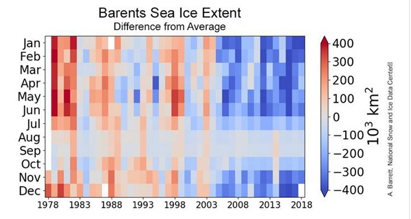 Evolution de la banquise en mer de Barents (Source: NSIDC)