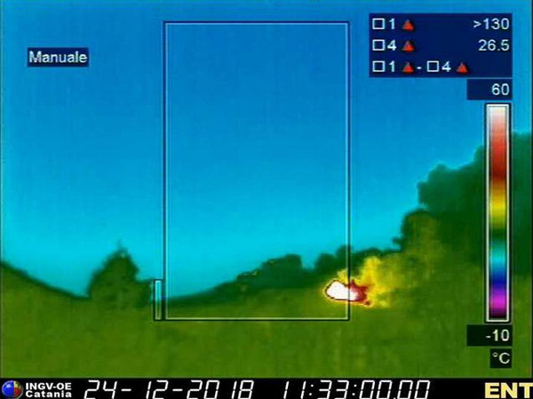 Shortly afterwards, intense strombolian activity began at the south base of the New Southeast Crater, towards Serra Giannicola, with the opening of an eruptive fissure. Strombolian activity also concerned Bocca Nuova and the North-East Crater. The GPS and clinometric networks showed deformations of the summit zone.