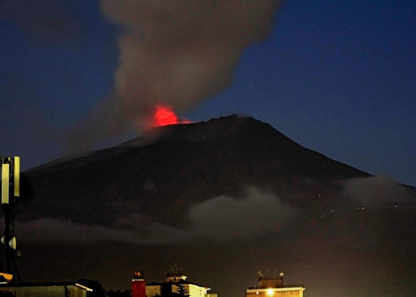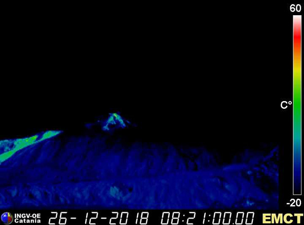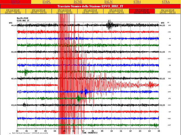 Le fait important de la nuit est un séisme de M 4,8 qui a affecté à 3h18 la région de Catane, avec un épicentre à 2 km au nord de Viagrande. Il a été ressenti par la population et, contrairement à ce qui a été dit au début, la secousse a causé des dégâts, comme à l’extérieur de l’église de Santa Venerina. Il est aussi fait état d’effondrements dans les hameaux de Fleri et Lavinaio,