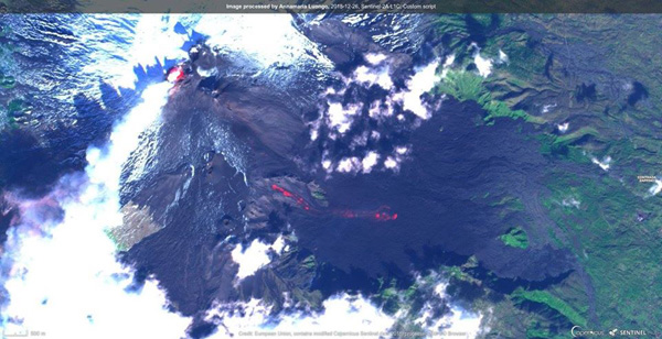 La coulée de lave née de l’éruption du 24 décembre 2018 vue depuis l’espace (Source: ESA)