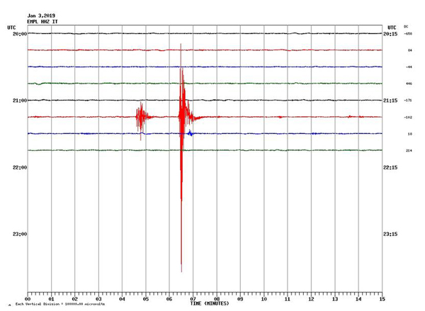 L’INGV a enregistré plusieurs nouvelles secousses ces dernières heures dans l’est de la Sicile, en particulier dans la région de Catane. Cinq événements ont été détectés par les instruments dans la soirée du 3 janvier 2019 entre 22 h et 00 h 20, avec une magnitude comprise entre M 2,3 et M 3,0. Une nouvelle secousse de M 3,0 a ensuite été enregistrée à 4h54 le 4 janvier. Les épicentres ont été localisés dans les secteurs de Ragalna, Biancavilla et Adrano. Un autre séisme de magnitude M 3,5 a été enregistré à 5h10 dans cette même région..