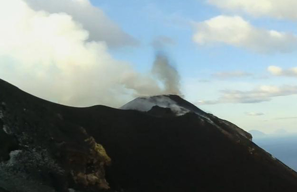 Vue du Stromboli vers 9 heures le 7 janvier 2019, avec un événement explosif d’intensité moyenne. Au premier plan, on distingue dans la partie NE du cratère le petit cône de matériaux en cours d’édification.