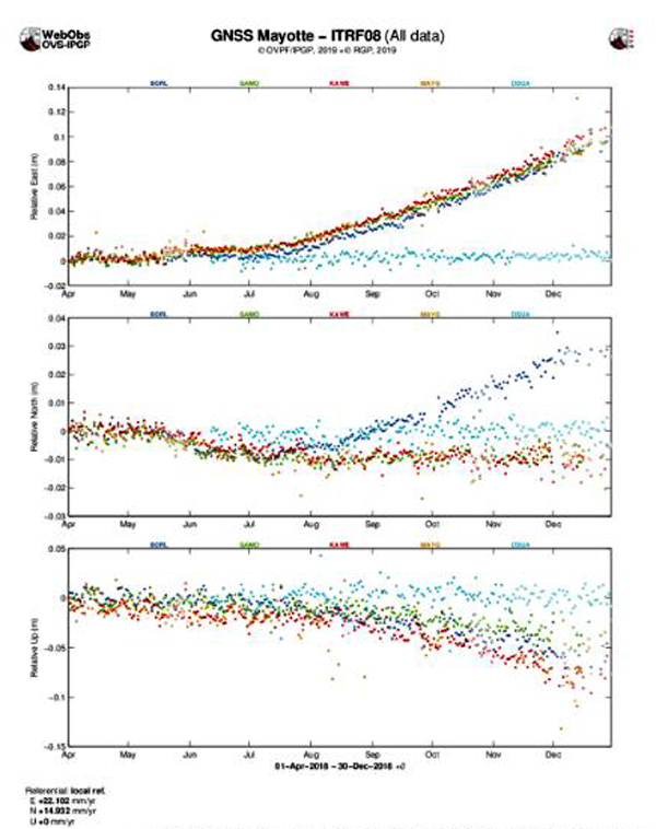 In parallel, data from the Teria network GPS stations installed on the island of Mayotte indicate since July an overall displacement of about 11 cm to the east