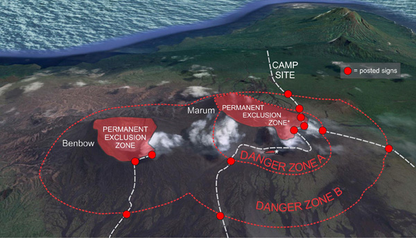 Volcanic activity is currently low and the alert level remains at 3. The danger zone remains about 2 km around Benbow and 4 km around Marum (see map). The additional area of risk is within 3 km from major cracks in the South East of Ambrym.