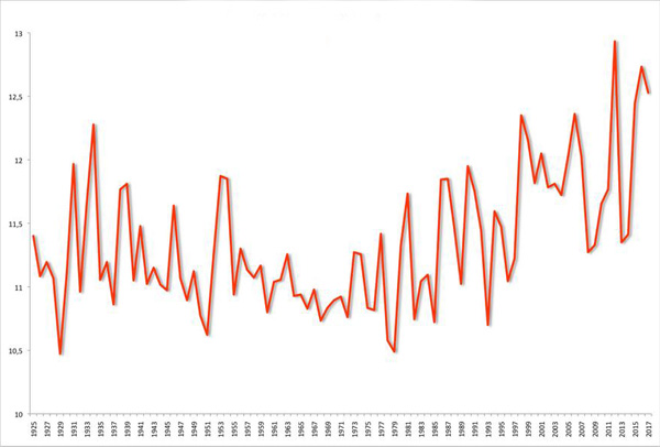 Température annuelle moyenne aux Etats-Unis entre 1925 et 2017 (Source : NOAA)
